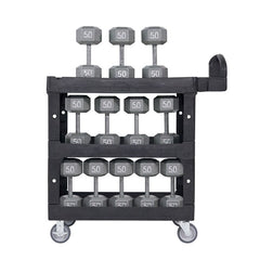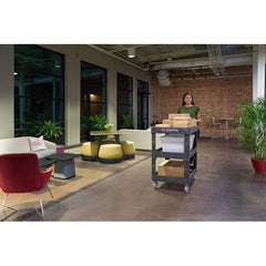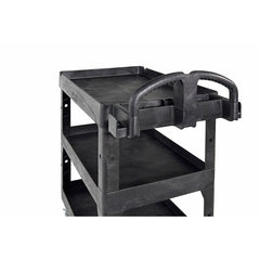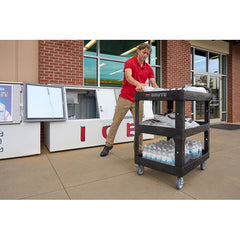 The BRUTE Heavy Duty Medium 3-Shelf Utility Cart with a lipped shelves is a durable versatile cart that is ideal for transporting materials, supplies, and heavy loads up to 600 lb. Cart provides 50% more storage capacity* to help move more materials efficiently throughout a facility. The lipped shelves prevent items from falling off the cart and features an integrated V-notch to hold pipe and conduit securely for safe cutting, and cart features 12" shelf clearance between each shelf to optimize use of additional storage capacity.