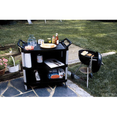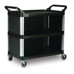 The Rubbermaid Commercial 4093 Utility Cart with Enclosed End Panels on 3 Sides, Black. 300 lbs Load Capacity, 40-5/8" x 20" x 37.8". Rounded corners won't damage walls. Upscale appearance is ideal for institutional, warehouse or front office use. Durable resin construction resists scratches, chips and rust. Lightweight and easy to handle with quiet, nonmarking casters. Comfortable, rounded handles. Measures 40-5/8" length by 20" width by 37.8" height.