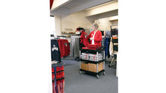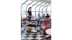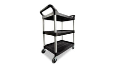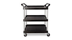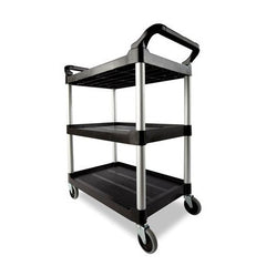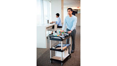 The Rubbermaid Commercial Service Cart is a versatile, durable service cart able to perform a wide variety of tasks. This rolling utility cart can support up to 200 lbs. and features easy-to-clean smooth surfaces, 4" swivel casters for easy mobility, and user-friendly easy-to-grip handles.