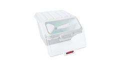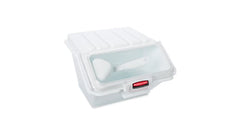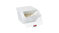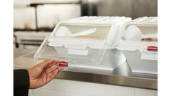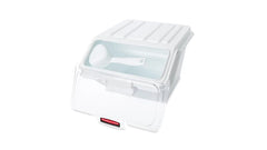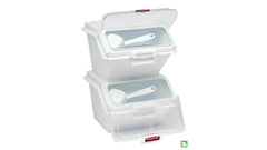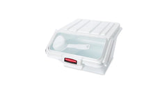 The Rubbermaid Commercial Shelf Ingredient Bin with Scoop offers quick one-handed access while stacked and an integrated measuring tool that increases preparation efficiency, space optimization, and promotes food safety compliance.