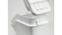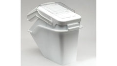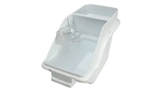 The Rubbermaid Commercial Shelf Ingredient Bin with Scoop offers quick one-handed access while stacked and an integrated measuring tool that increases preparation efficiency, space optimization, and promotes food safety compliance.