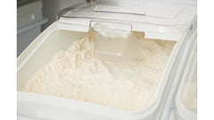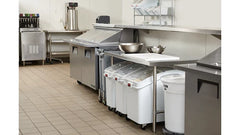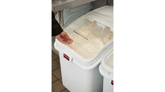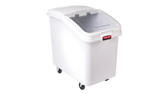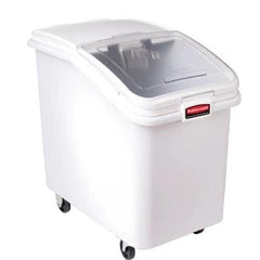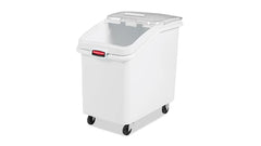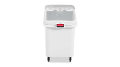 The Rubbermaid Commercial ProSave Ingredient and Food Storage Mobile Bin is a bulk food storage container on wheels. With a slanted front, sliding opening, and 32-ounce scoop, these food storage containers make it easy to transport ingredients.