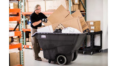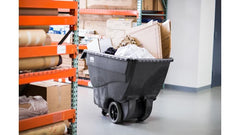 The Rubbermaid Commercial Tilt Truck, Structural Foam, offers industrial strength construction to transport heavy loads up to 600 lbs. These dump trucks fit through standard commercial doorways and onto elevators easily. The non-marking casters reduce touch-up cleaning. The constant force design allows for controlled dumping by one person. The dump truck is easy to clean and virtually maintenance free. Its unique "steering wheel" handle provides excellent maneuvering capability. Optional domed lid is available.