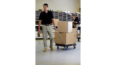 - Three-position handle lets users push, pull, or fold flat for use as a dolly