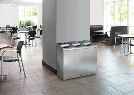 - Heavy-gauge steel recycler with a damage-resistant powder coat finish features contoured edges and magnetic connections that keep receptacles perfectly aligned to one another for a professional appearance
