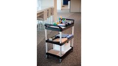 The Rubbermaid Commercial Service Cart is a versatile, durable service cart able to perform a wide variety of tasks. This rolling utility cart can support up to 200 lbs. and features easy-to-clean smooth surfaces, 4" swivel casters for easy mobility, and user-friendly easy-to-grip handles.
