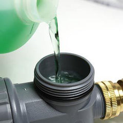 For adding cleaning liquid to pure water flow. Simple connection to standard garden hose.